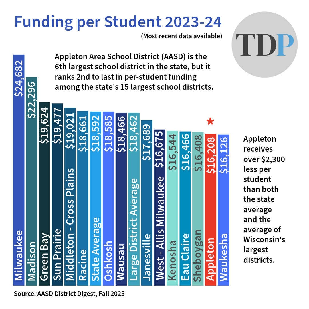 Appleton ranks sixth out of seven comparable-sized school districts in per-student revenue, about $2000 below the state average.