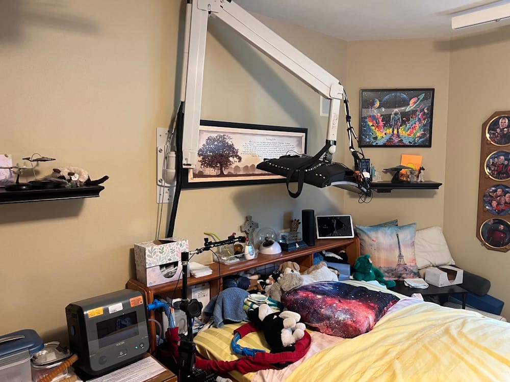His bed is even more high-tech with a monitor that hovers above him like the light above a dentist’s chair. He does much of his work on that monitor using a similar toggle operation as the one on his chair.