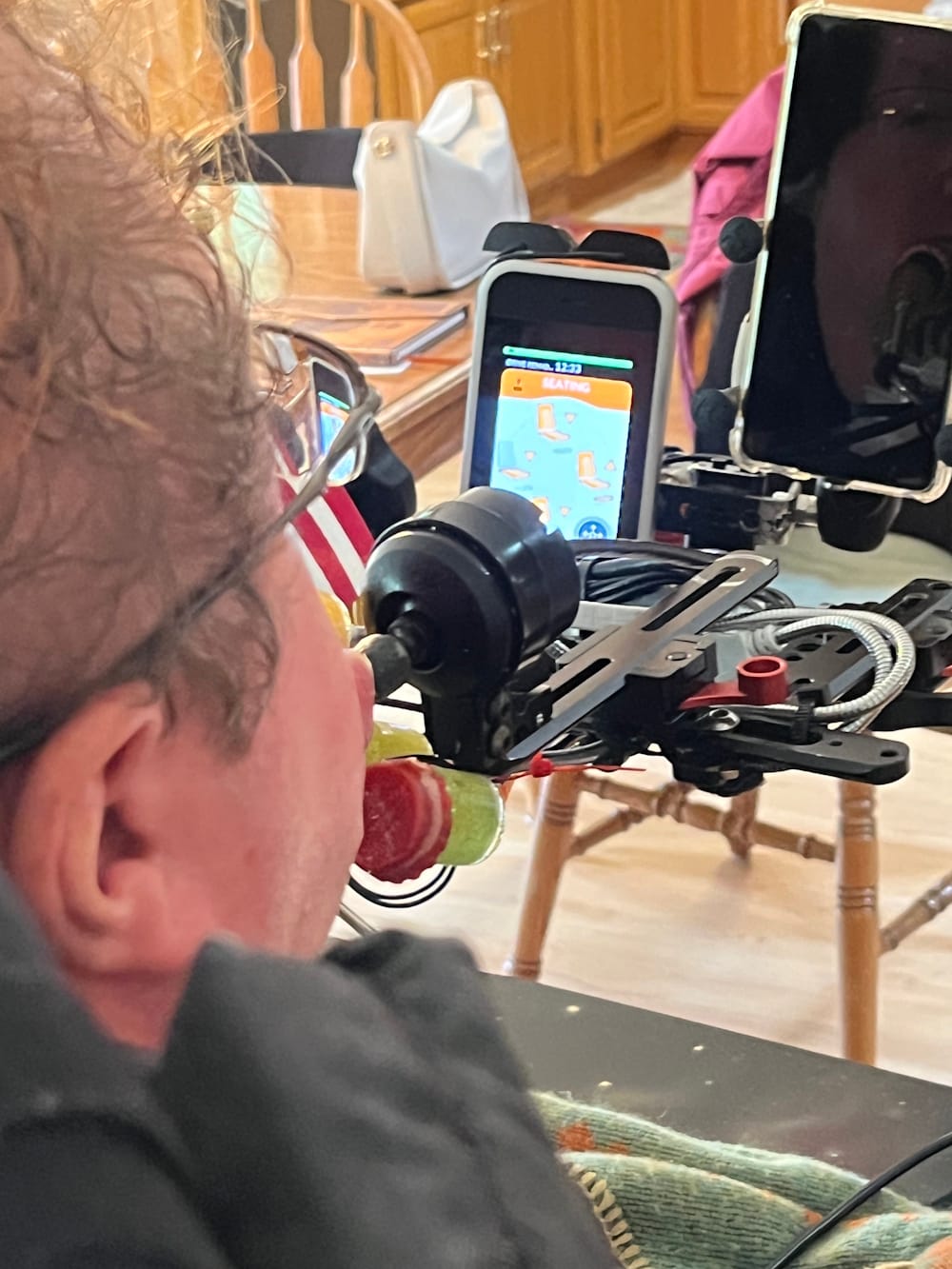 Directly in front of his tongue is the toggle – his control center. He smoothly scrolls through his phone, taps on icons, checks his upcoming appointment, brings up the keyboard, pecks out messages – all via agile flicks of his tongue that maneuver the toggle.