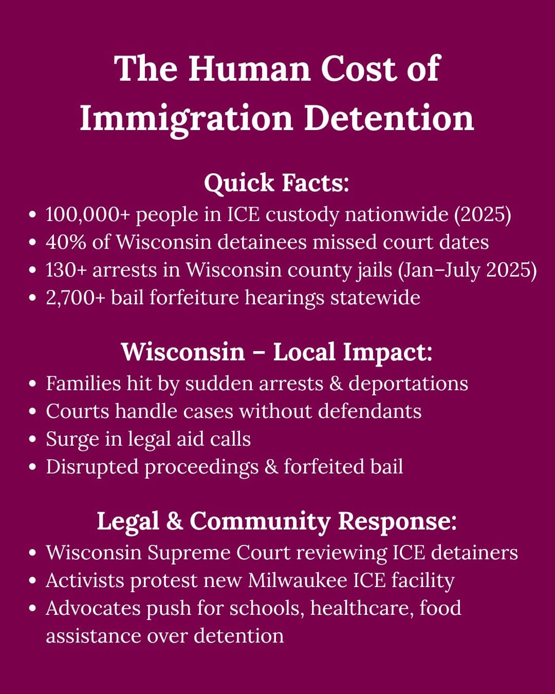 While Wisconsin has no large detention centers, local immigrant communities face sudden arrests and deportations, disrupting families and criminal cases. Legal aid organizations report a surge in calls from family members trying to locate loved ones in custody.