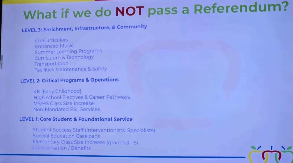 Any proposal put forward in 2026 would be an ‘operational’ referendum covering normal operating expenses, such as salaries, maintenance, utilities, and other inflationary costs. Without additional funding, the district would be forced to consider cutting staff, eliminating programs, or even closing schools.