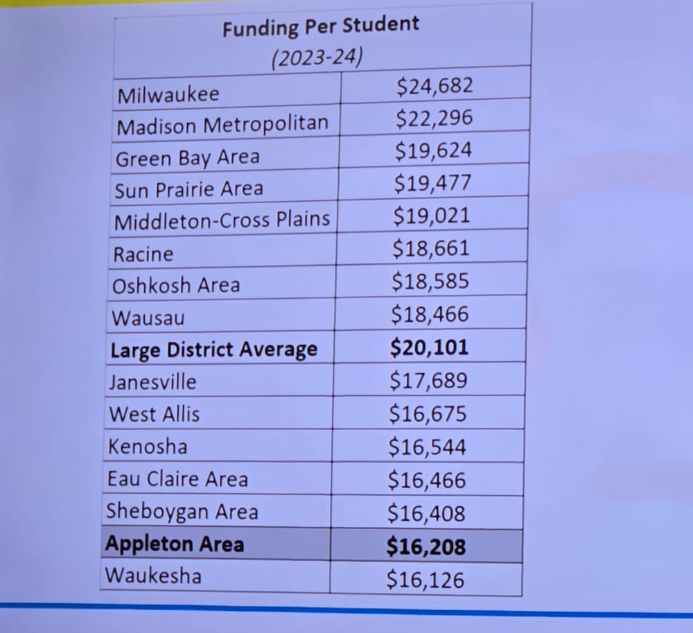 Out of 15 comparable-sized school districts, Appleton ranks 14th in spending per student. Should the district need to cut $13 million from its budget, it would rank dead last.