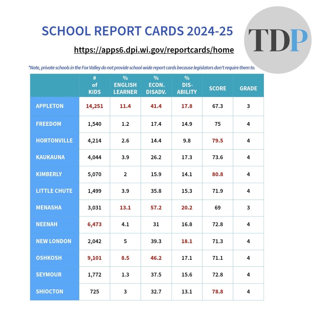 There appears to be a clear correlation between the percentage of high-needs students (which includes, in addition to students with special needs, the economically disadvantaged and English Learners) and the report card scores. A rating of ‘three’ means meets expectations. A ‘four’ means exceeds expectations.