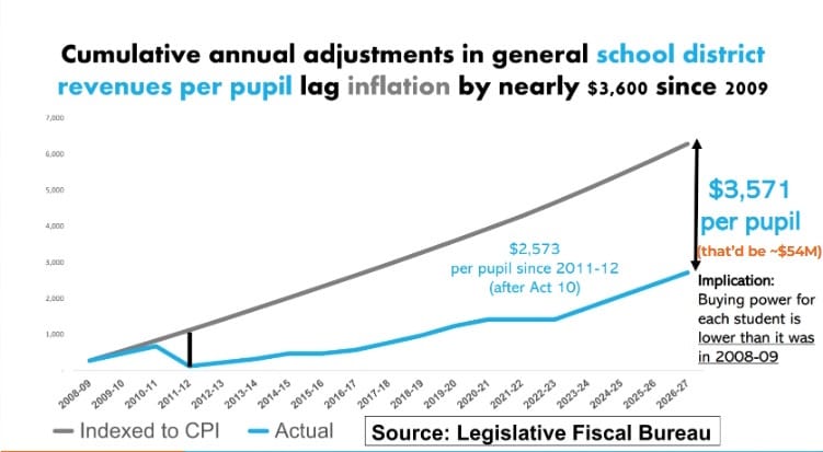 FoAS and other public education advocates point to a variety of factors that they say combine to put an unsustainable financial squeeze on public schools. Those aforementioned revenue limits headline the list but right beneath that, they say, is the loss to inflation since the state decoupled cost-of-living increases with state aid to education starting in 2008. Over that period, according to the Legislative Fiscal Bureau, per-pupil funding is down more than $3,500 in the Appleton Area School District, costing the district, conservatively, $54 million overall.