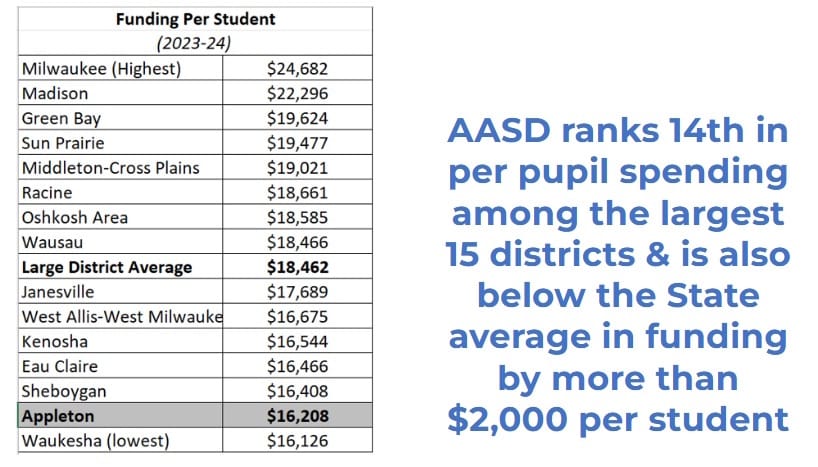 It’s worse for AASD, considering per-pupil funding in the district lags the state average by nearly $2,000 per student, ranking Appleton’s district 14th of 15 districts around the state.