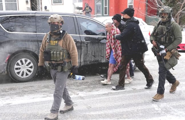 ChongLy Thao, a Hmong American, is led out of his St. Paul home in frigid temperatures in only his underwear and a pair of crocs, a flimsy blanket draped around his shoulders. Video shows nearly a dozen ICE agents, guns drawn, banging through the front door of Thao’s family home and moments later Thao, in handcuffs, taken to an agency vehicle.
